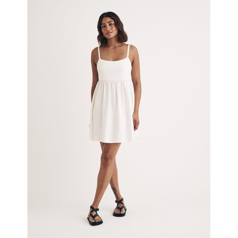 A free-flowing mini. This white denim dress is the perfect choice for your wardrobe. A full skirt and barely-there straps allow for plenty of movement. Style yours with summer sandals.