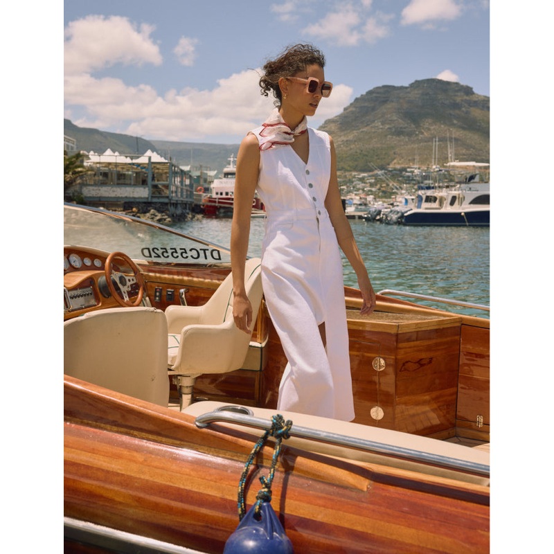 Your new go-to. With a V-neck, button detailing, pockets, and seam details, this white denim dress has all the right touches. Plus, a front slit at the maxi skirt for the perfect finish.