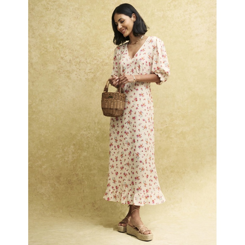 Delilah is a tea dress with a twist. This white midi is decorated with delicate blooms, perfect for any occasion. A low neckline plunges into a v-shape, offset by pretty puff sleeves trimmed with pleated edges and a frill hem. Wear yours with carefree flatforms.