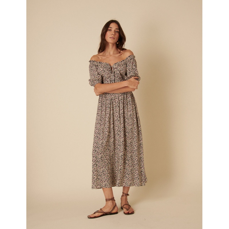 Off-the-shoulder and into your basket. Genevieves a vintage-inspired rose print dress thats all about detail. The puff sleeves pull down and can be worn as a Bardot. Subtle ruffles are accompanied by a corset-inspired waistline with string ties. Style yours with suede boots.