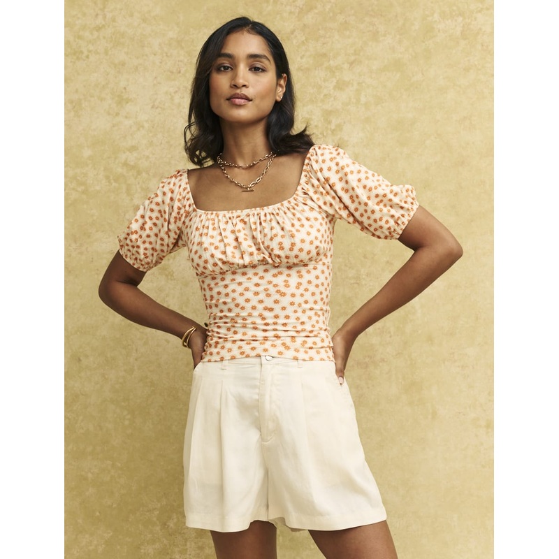 Oh this new number? This white and orange floral top is sure to elicit all the compliments. It comes with a square neckline, ruched bodice and puff sleeves. Wear yours with flippy white shorts on holiday. Square neck Short puff sleeves Soft stretch jersey