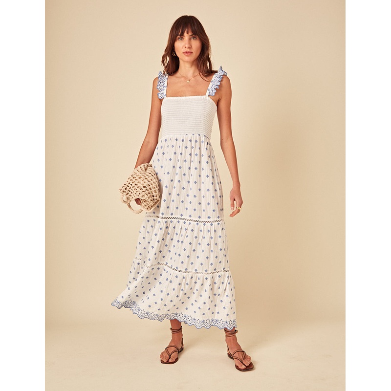Your new sunshine staple. Coming in white with delicate blue embroidery, the Maryam midi dress features a smocked bodice, and tiered layers for the perfect summer look. Were in love with the embroidered scallop trim. Style with sandals and touches of gold.