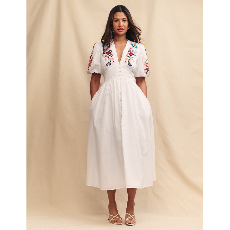 Our iconic style: Starlight. This white one comes embroidered with carefully stitched summer florals. Were obsessed with her soft gathering, puff sleeves and pretty line of covered buttons shes even got pockets. Were wearing ours with barely-there sandals.