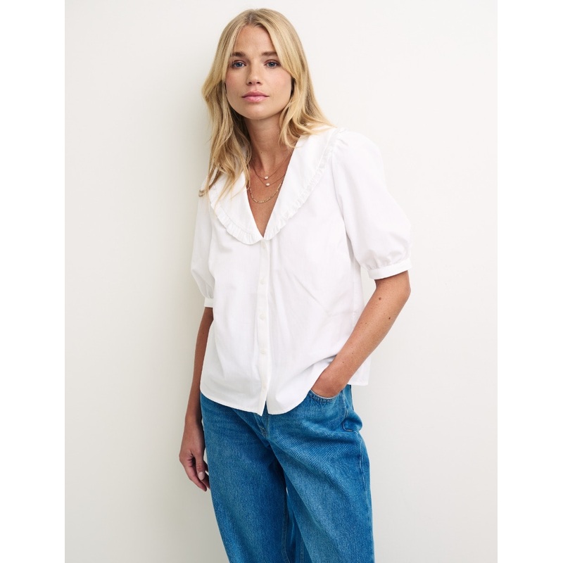 We just cant get enough of the Peter Pan collar. Trimmed with a flouncy ruffle, this white shirt is made from smooth organic cotton that dips into a v-neckline. We also love the puff sleeves. Style yours with jeans and gold accents. Drop collar Short puff