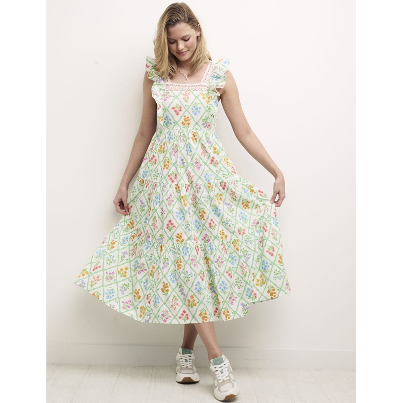 Our garden trellis print in a sun dress. The fit is super easy, with breezy tiers and a touch of subtle stretch added to the waist. Oh and we havent even got to the romantic ruffles, heart lace trim and bow detail yet. Lets just say were seriously swooning