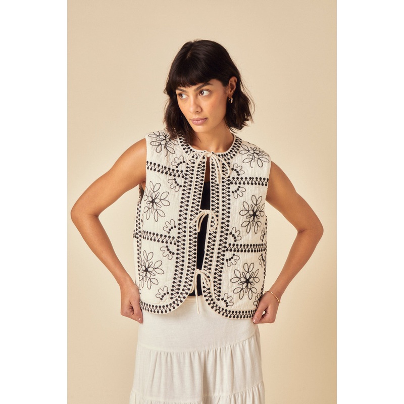 Layer up in Layla. Our waistcoat is an effortless layering piece. We love the black embroidered detail and string ties. Style over all your outfits.