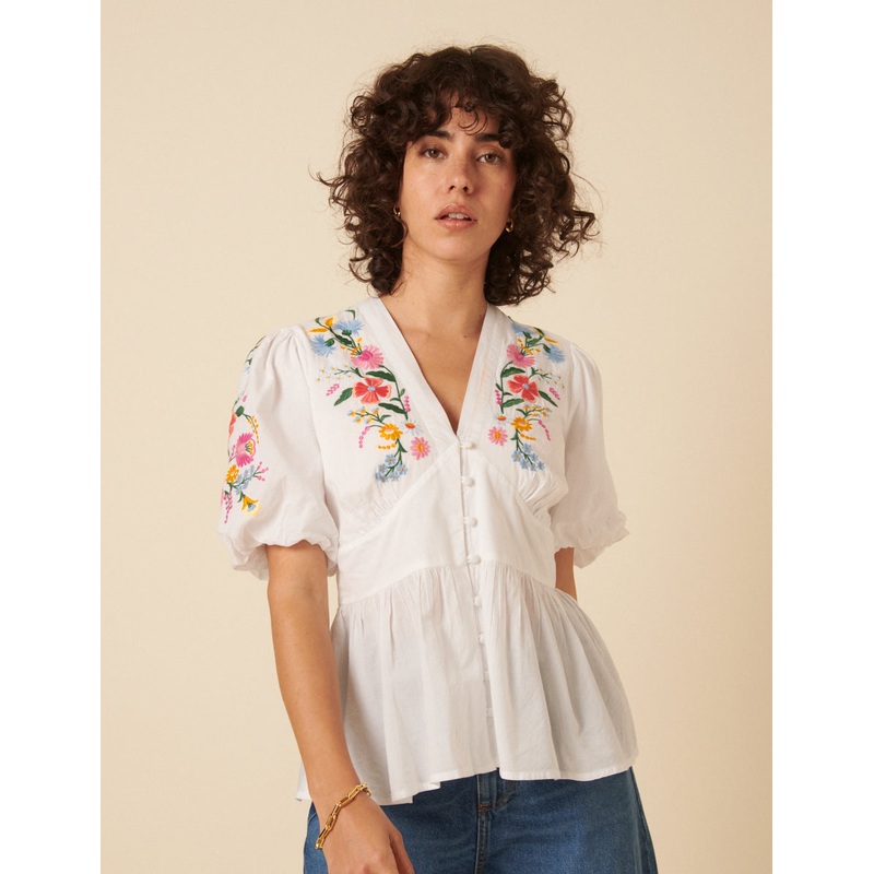 Weve taken everything you love about Starlight, and made her into a top. Coming in crean, we love the v-neckline, pretty line of covered buttons and statement puff sleeves. Style with your favourite NC jeans. V-neck Button-through placket Short puff sleeve
