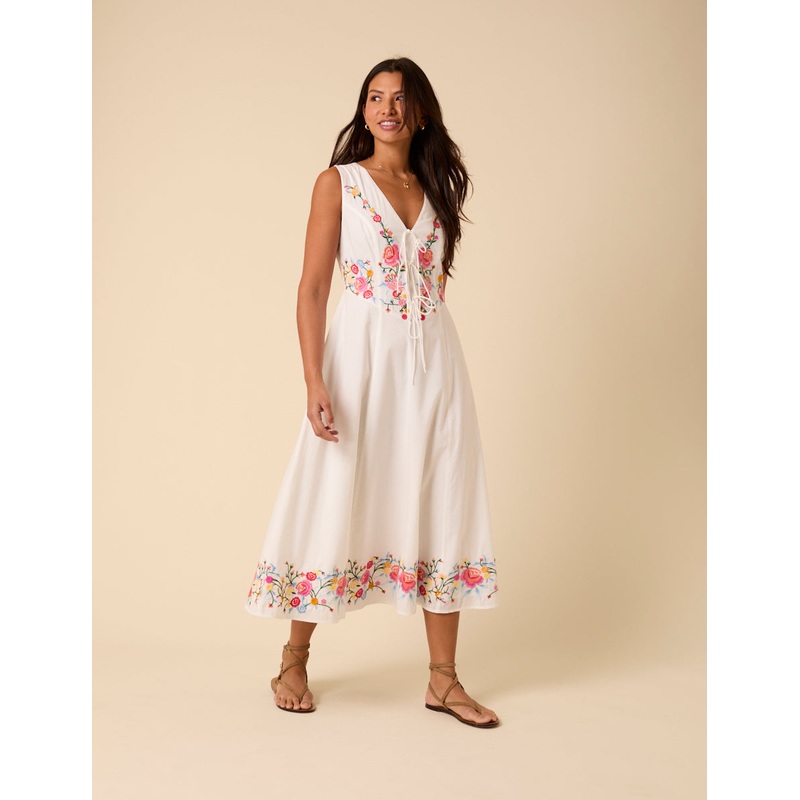 Embroidered to perfection. Coming in white, our midi combines intricate floral detailing with a timeless silhouette. Were obsessed with the tie front details. Shes best styled with sandals and gold jewellery. V-neck Tie details Size tip: we recommend your