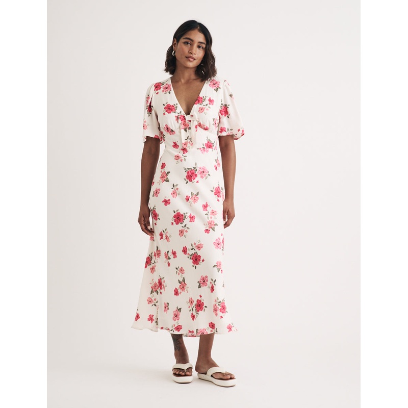Our love for Faith is well and truly blooming. Your new forever floral, this white midi dress is detailed with pink flowers and a flattering v-shaped neckline. Finished with a so-now artful bow, style yours with layers of gold jewellery.V-neckShort sleeves
