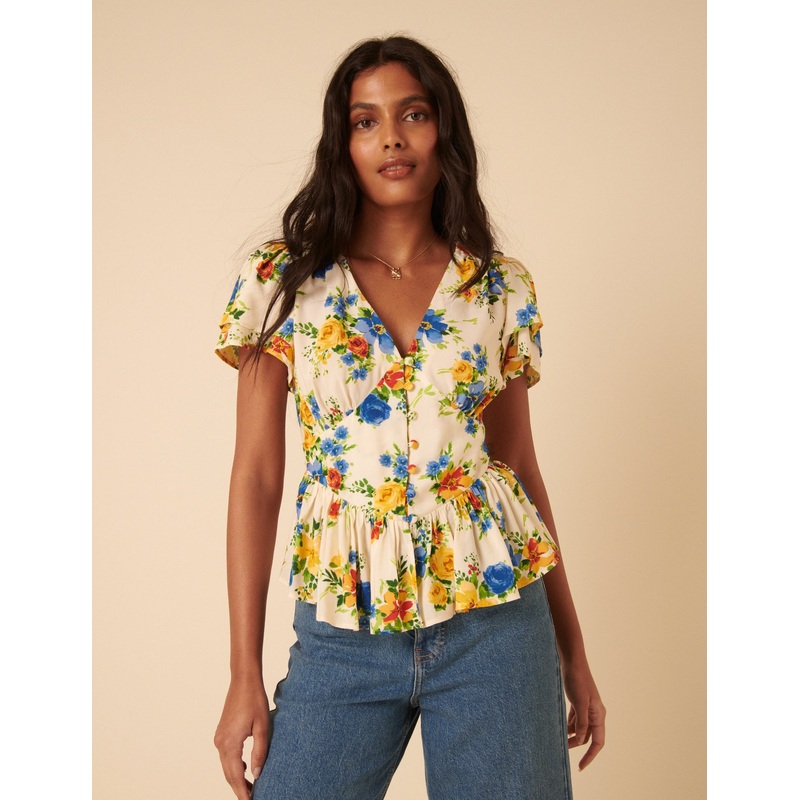 Vintage florals with a soft touch. In cream with yellow and blue blooms, this floaty peplum top features flutter sleeves and a button-down V-neck. V-neck Panelled waist designed to flatter Button front Size tip: we recommend your usual size