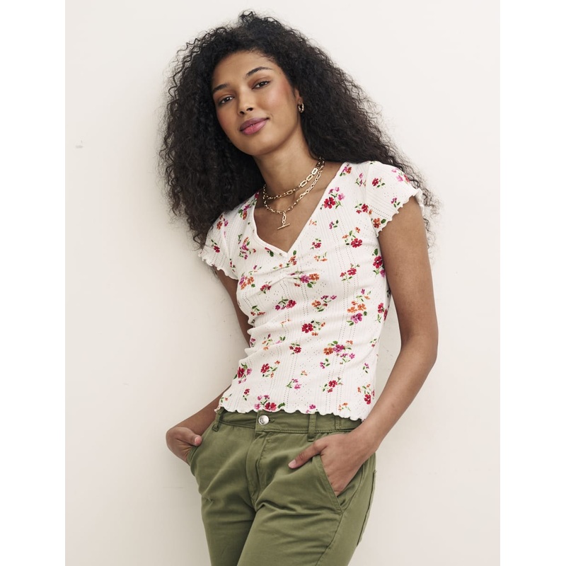 "Not your average tee. This white top is about detail, with pointelle all over and stitched lettuce trims. Team yours with the matching cardigan. V-neck Cap sleeves Designed for a close cut"