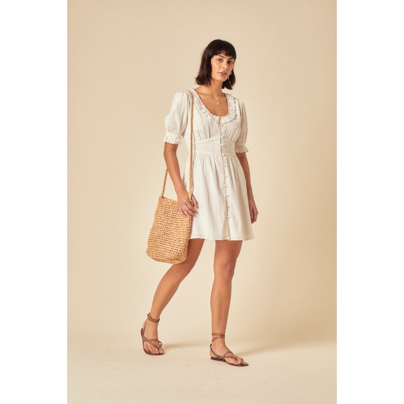 Scoop neck Short puff sleeves Covered buttons Panelled waist Size tip: we recommend your usual size