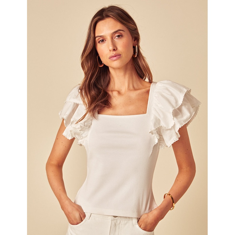 All the frills. Coming in white, our top features bold frilled shoulders and contrast stitching. Pair with your favourite NC jeans. Square neck Short sleeves Designed for a close cut Size tip: we recommend your usual size