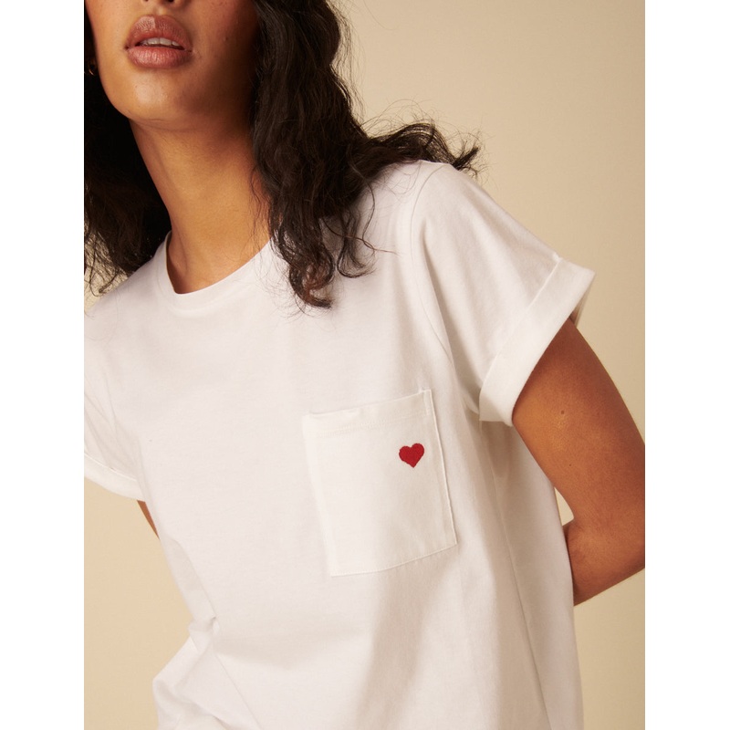 Add an embroidered touch to your staple t-shirt collection. Our classic white t-shirt is designed with a round neck and features red heart embroidery at the pocket. We love the short turn up sleeves and a relaxed fit. Style yours with everything you already own.