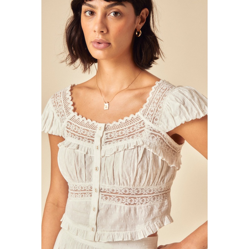 Our top is pure romance. With lace, ruffle trim and button-down detail, our white top is perfect to style with our matching skirt for an effortless look. Sweetheart neck Short sleeves Button front Size tip: we recommend your usual size