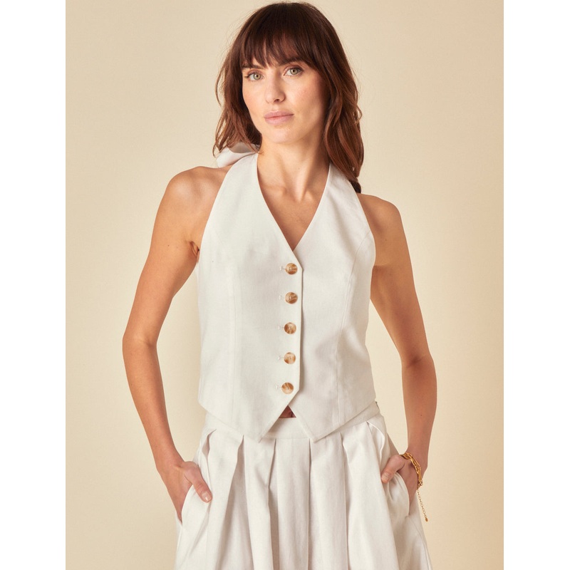 A new take on the waistcoat. Finished with a halter neck that loops into a statement bow at the back, this white number is perfect for the most special of occasions. Halter neck Button front detail Size tip: we recommend your usual size