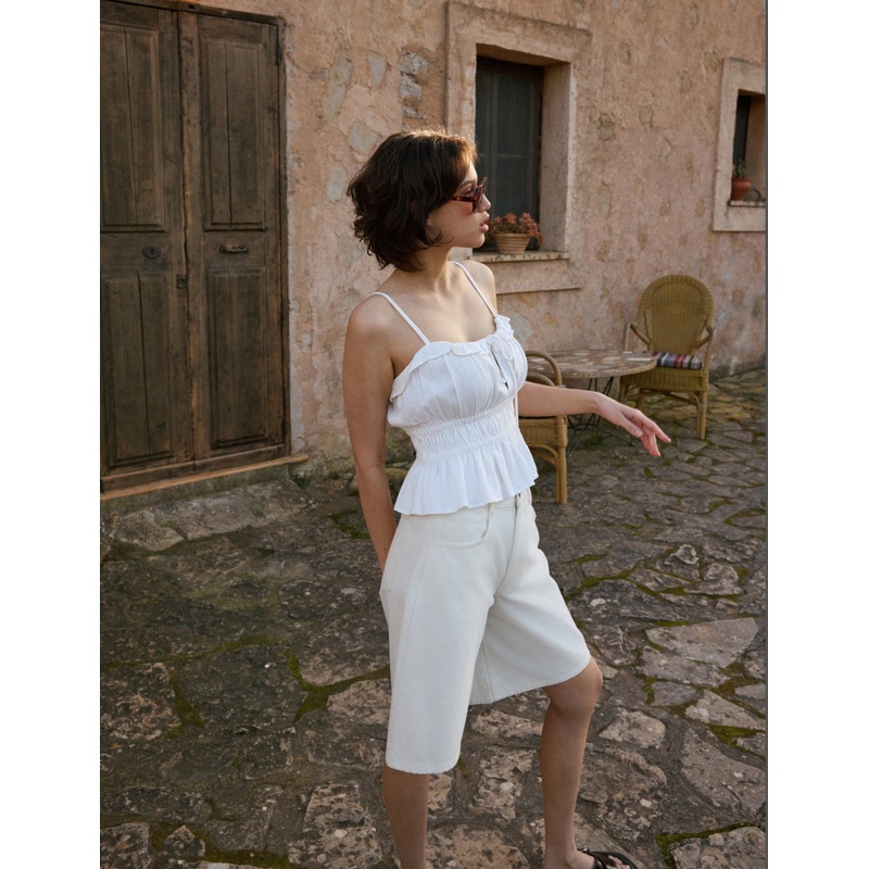 A little romance. Coming in white, our cami top features delicate frills, and a relaxed silhouette with a pretty bow-tie front. Style with everything you already own. Spaghetti straps Shirred bodice that defines the waist Tie front detail Size tip: we reco