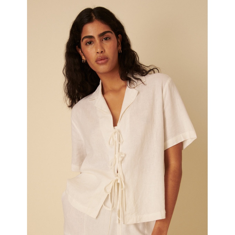 So simple. Coming in white, we love the classic collar and tie front detail. With a relaxed fit, its perfect for effortless summer styling. Pair it with wide-leg trousers or denim for a laid-back look.