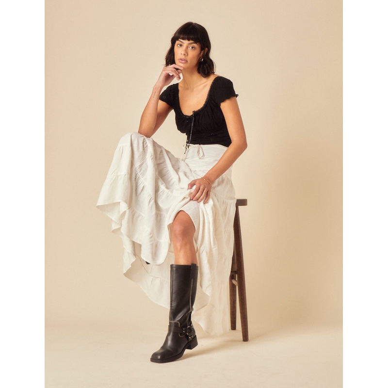 The only white maxi skirt you need. With the perfect amount of volume and a tiered silhouette, its made for days in the sun. Just add a top and sandals.