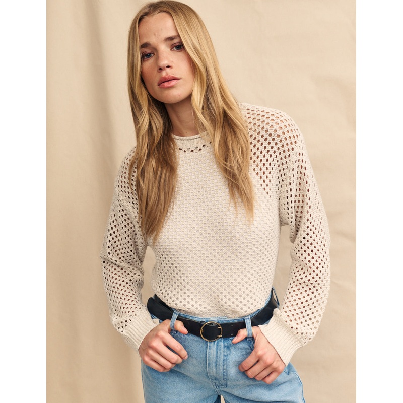 The perfect layering piece, make sure to snap up this mesh stitch jumper whilst you can. This one comes in cream for summer. Were wearing ours with denim.Round neckLong sleevesDesigned for a relaxed fit