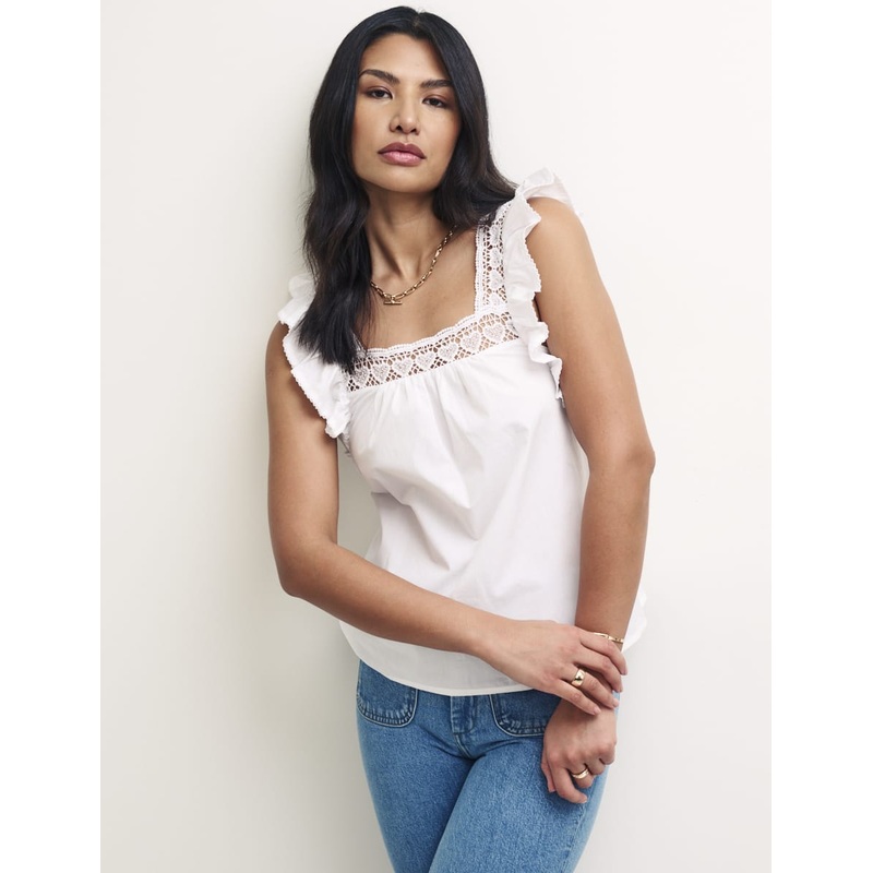 Were really into ruffles, especially on Monroe. Shes a white trapeze top thats both light and breezy. Theres lots to love from the front a square neckline and heart lace trim but turn around and youll reveal a statement bow that falls elegantly down your b