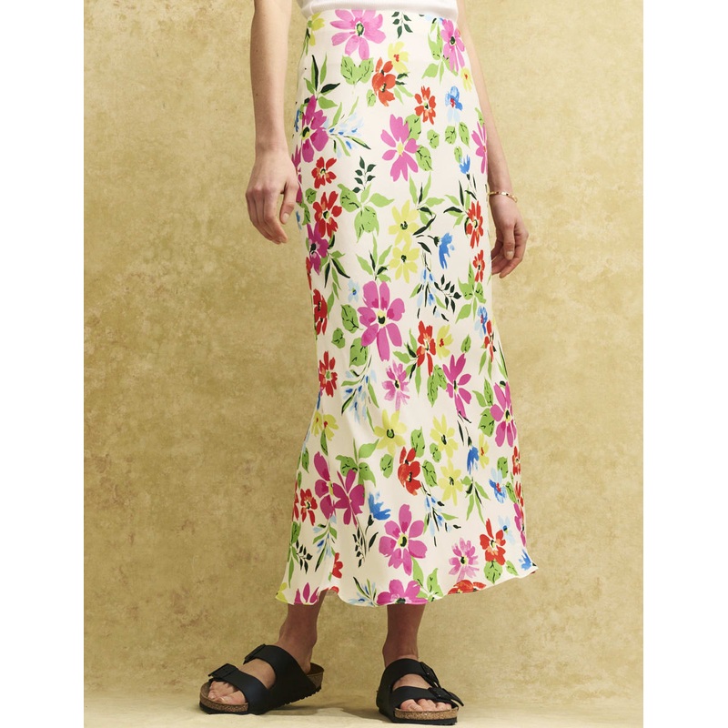 Our sell-out Mila skirt is back in white satin blossoming with watercolour florals. Its made in a body-skimming cut that flares at the hem. Were wearing this one with chunky slides.Elasticated waistBias cut