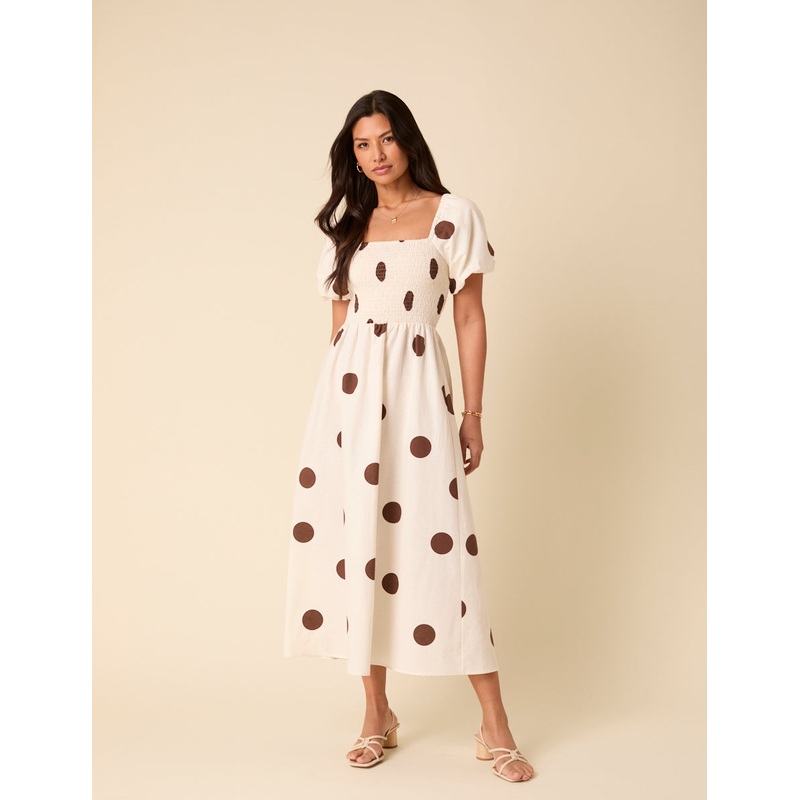 White Polka Dot Linen-blend Tasmin Midi Dress