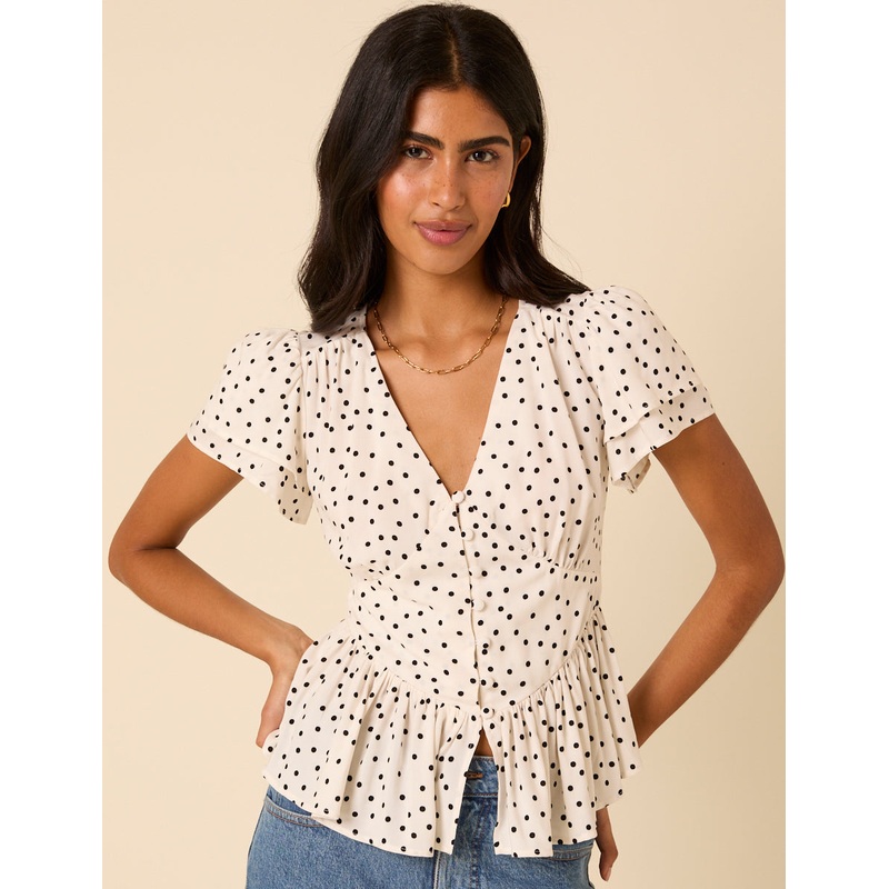 Save a spot for polka dots in your wardrobe. Finished with angel sleeves and a swishy peplum hem, this black and white number was made to go with your favourite jeans.