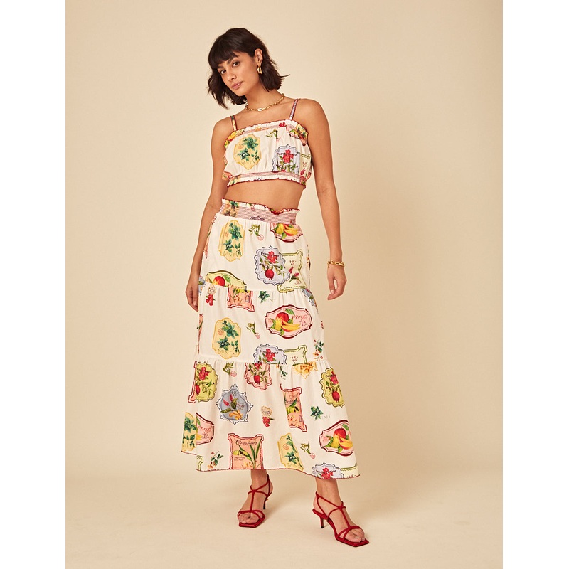 Easy breezy. Coming in a soft cream with a vintage-inspired print, our tiered midi is all about effortlessness. Style with our matching top and sandals.