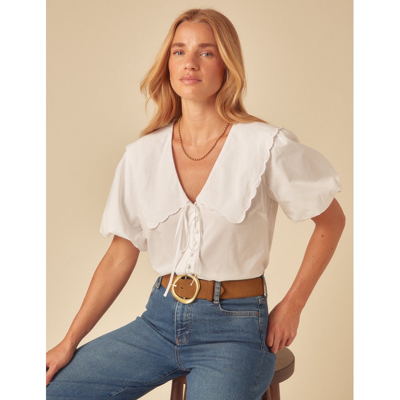 Our much-loved Birdie blouse is back with short puff sleeves. Dont miss the delicate scallop trim, string tie detailing and fabric covered buttons. Shes so easy to dress up in broderie anglaise. Were in love with the star design. Elevate yours with barely-there sandals.