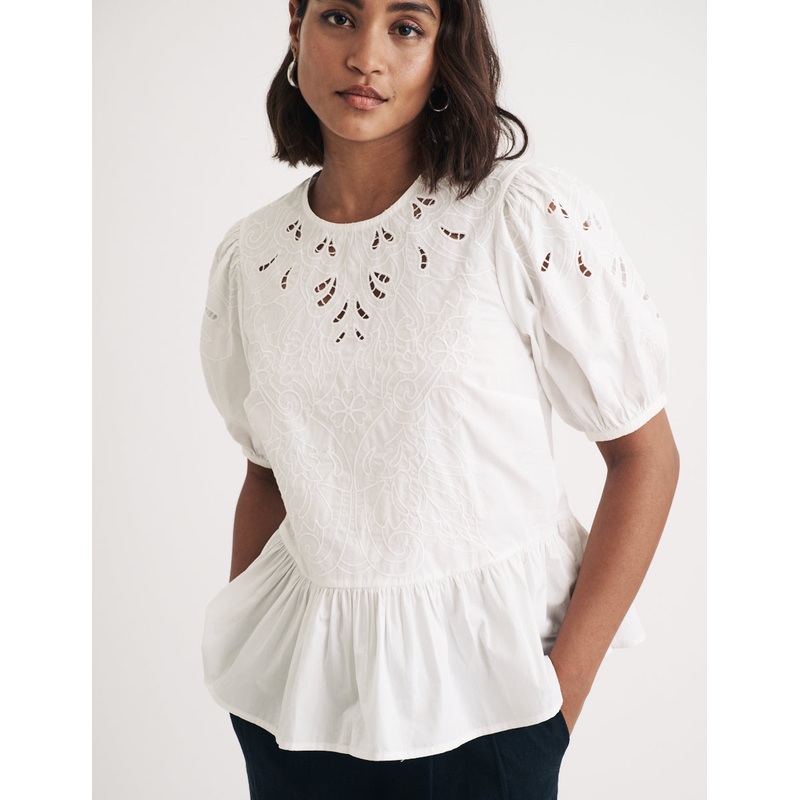 A cut above the rest. This elevated white top proves it really is all about the details. Were obsessed with the intricate cut out detailing, flattering peplum hem and so-now puff sleeves. Wear with your favourite wide leg trousers.