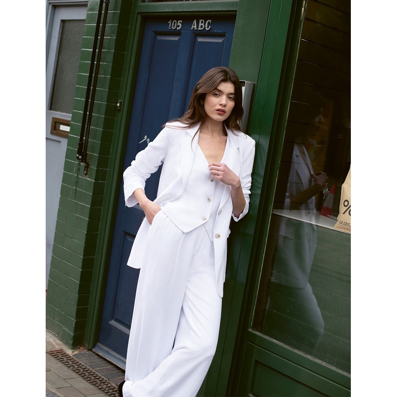 The definition of relaxed tailoring. These white high waisted trousers will take you to all kinds of summer events. A wide leg cut is elongated by soft pleats. Team yours with the matching waistcoat for a so-now look.