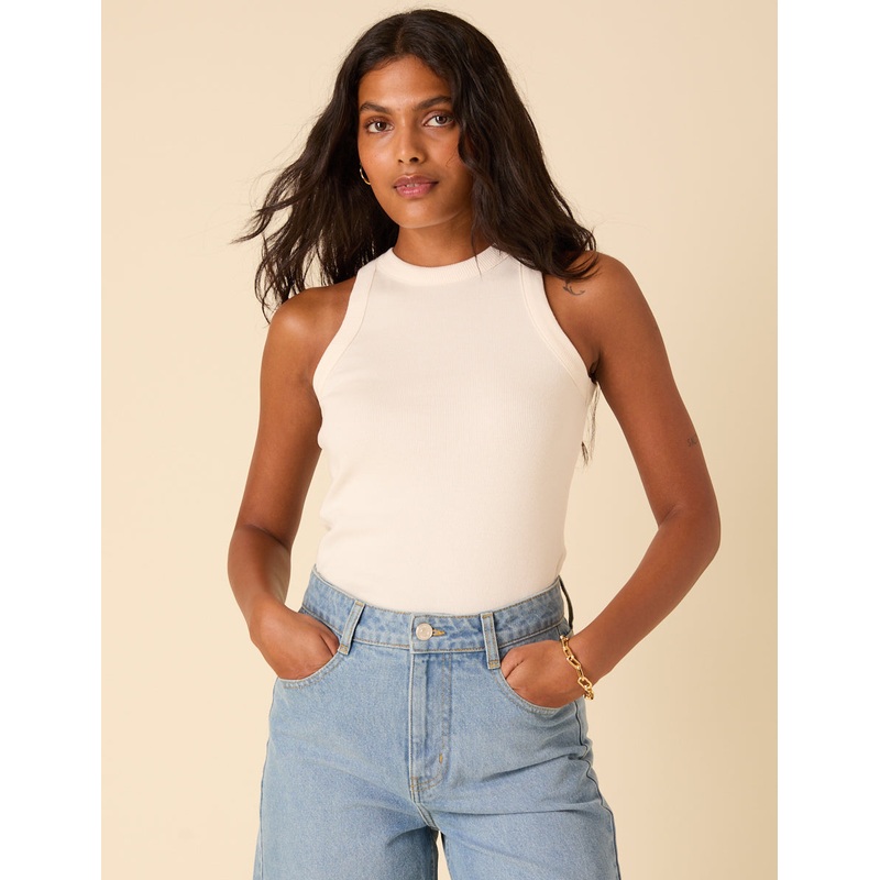 This white ribbed racer vest is a wardrobe must-have. Effortless, versatile, and perfect for layering or wearing solo.