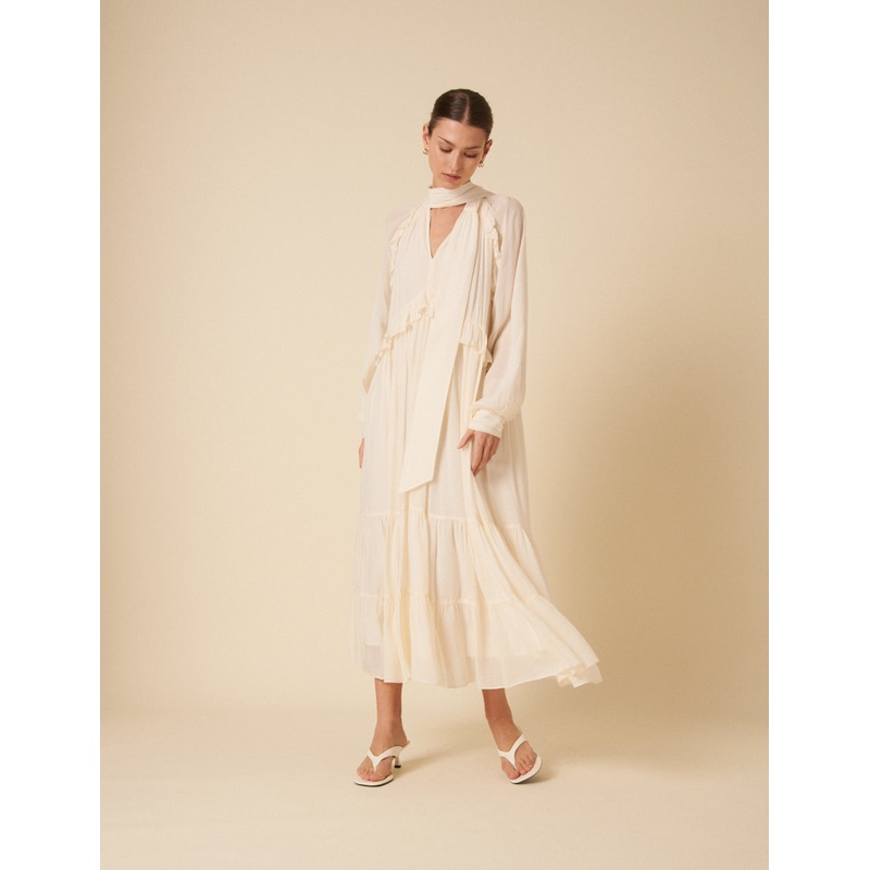 So now, so 70's. Bohana is back in a new cream colour. Featuring a classic v-neck, long balloon sleeves and romantic ruffles, shes ideal for any occasion. We love her stylish neck scarf too. Style with suede boots and touches of gold jewellery. V-neck Scar