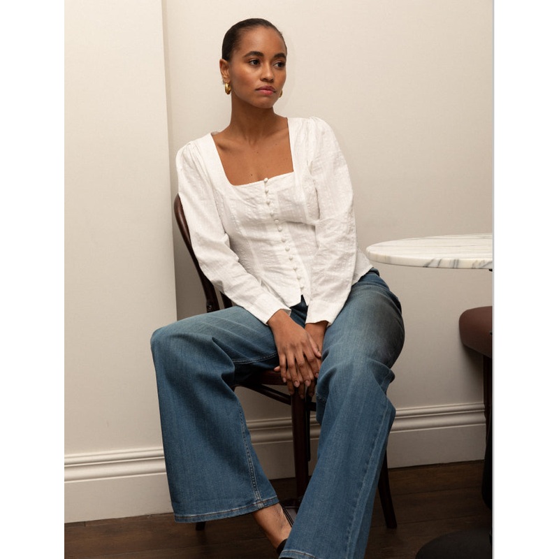 Your new go-to top. Our Minerva top comes in white. We love the fabric covered button-front, square neckline and nipped in waist. Were wearing ours with denim.