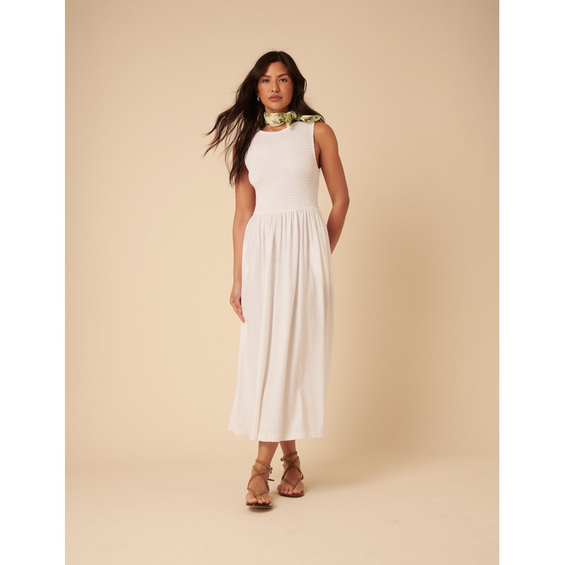 Round neck Shirred bodice Side pockets Size tip: we recommend your usual size