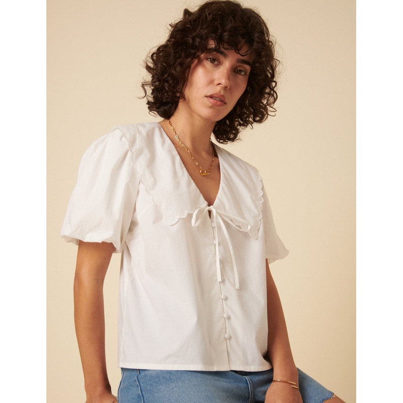 The Peter Pan collar is here to stay. Coming in white, this season the trend is back with a delicate scallop trim, string tie detailing and fabric covered buttons. Style with everything you already own. Drop collar Short sleeves Covered buttons Size tip: w