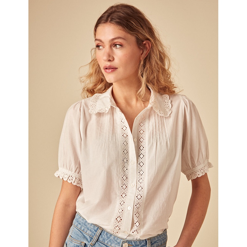 Romantic and effortless. Our white broderie blouse is detailed with intricate embroidery and a delicate collar. Looks best tucked into NC jeans.CollarShort sleevesButton-up front