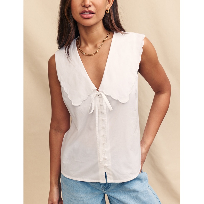 Birdie is back but with a twist in white. She has the same scallop trim and string tie detailing but this time shes sleeveless. Just when we thought we couldnt be more obsessed. Elevate yours with light wash denim and gold jewellery.Drop collarCovered butt