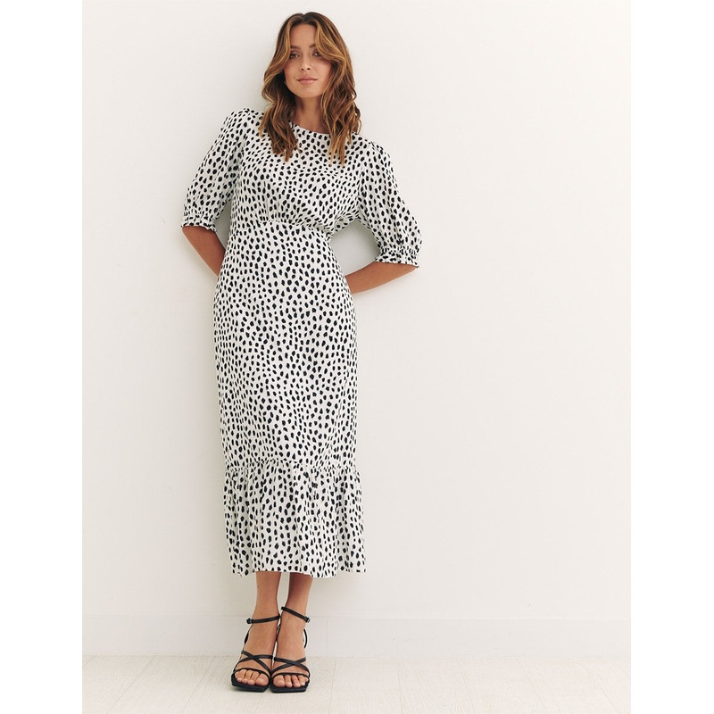 Another Selena day dress for your collection, re-edited in a white speckle print. Its softly shaped with elbow sleeves and a floaty hemline. Wear it with trainers, chunky boots or heels.Round neckElbow sleevesCurved underbust seamKeyhole back button fasten