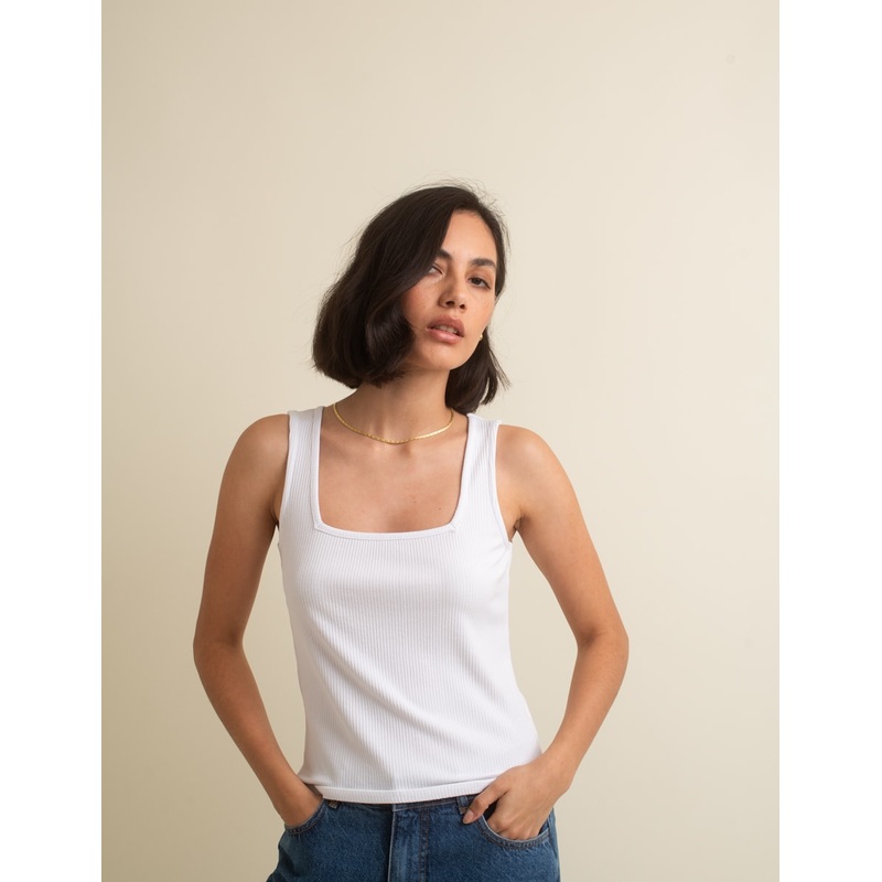 Nothing defines the collarbone quite like a square neckline. This stylish white vest will go with everything from winter cargos to spring minis and year-round jeans. Add layers of chunky gold jewellery to dress it up.Square neckSoft stretch fabricRibbed te