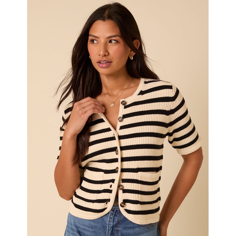 The cute cardi. In a cream and navy stripe, this one comes with a crew neck, contrast buttons, and short sleeves. Wear with your favourite NC jeans.Crew neckButton frontShort sleeves Patch pocketsDesigned to be semi-fittedSize tip: we recommend your usual