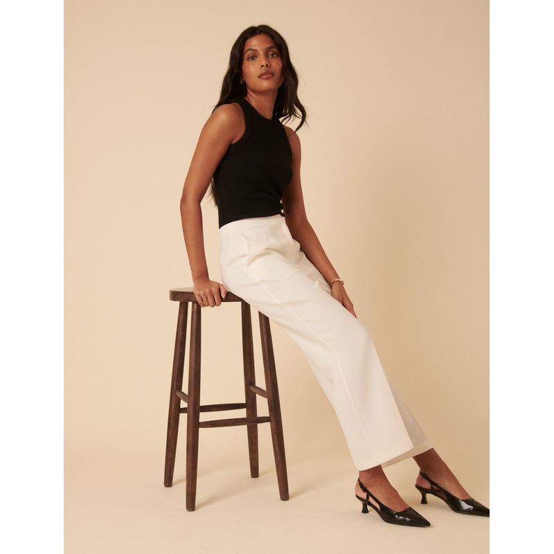 Your new uniform. Coming in classic white, our Etta trousers are cut with a clean front, a wide-leg cropped silhouette and sharp pleats for a tailored look.