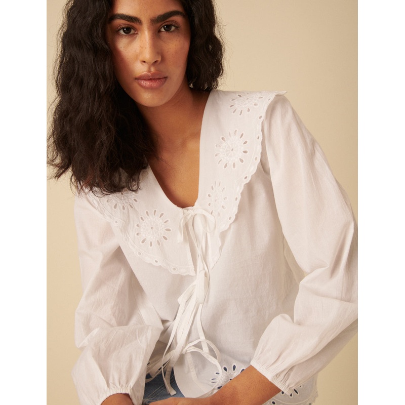 So breezy. This white blouse features brodeire detail at the V-neckline and hem. We love the billowy blouson sleeves and pretty trio of string ties details the front, creating a so-now spin on a classic look. Style yours with denim.