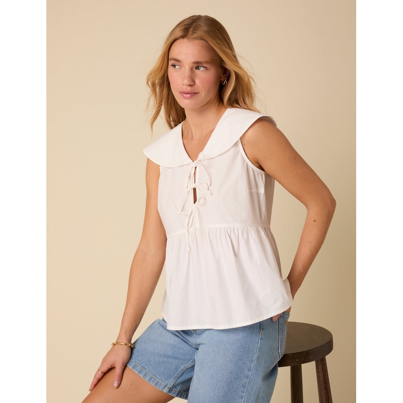 The blouse your wardrobes been waiting for. In classic white, our blouse features a statement collar and pretty trio of ties, we love the slightly peplum hem too. V-neck String tie detail Elasticated waist for comfort Size tip: we recommend your usual size