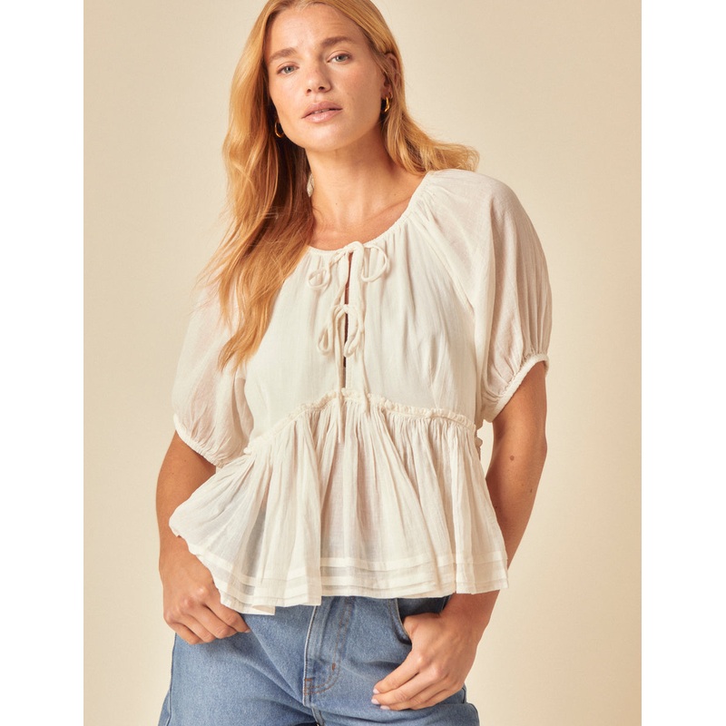 Summer-ready. This cream top is designed with soft gathers, a round neckline and voluminous sleeves for a relaxed yet refined look. We love the tie details too. Round neck Short puff sleeves String tie detail Peplum hem that defines the waist Size tip: we