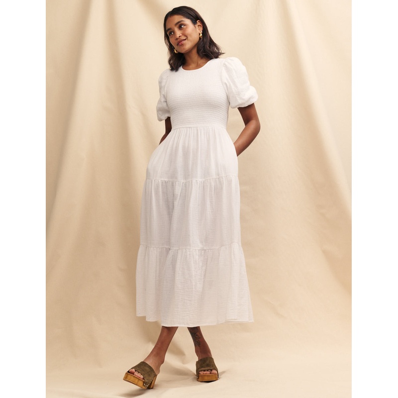 Round neck Short puff sleeves Shirred bodice A-line skirt Size tip: we recommend your usual size