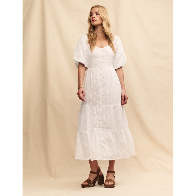 All-white-everything. Were obsessed with her swishy tiered skirt and so-now puff sleeves. Pair your new favourite floaty midi with trainers now and strappy heels later. Square neck Mid-length puff sleeves Button front
