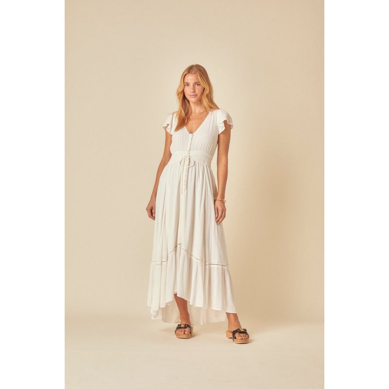 Float through the season. With a feminine V-neck, flutter sleeves and a soft high-low hem, this white midi dress brings the breeze with it. V-neck Button front Panelled waist designed to flatter String tie detail Designed to be semi-fitted Size tip: we rec