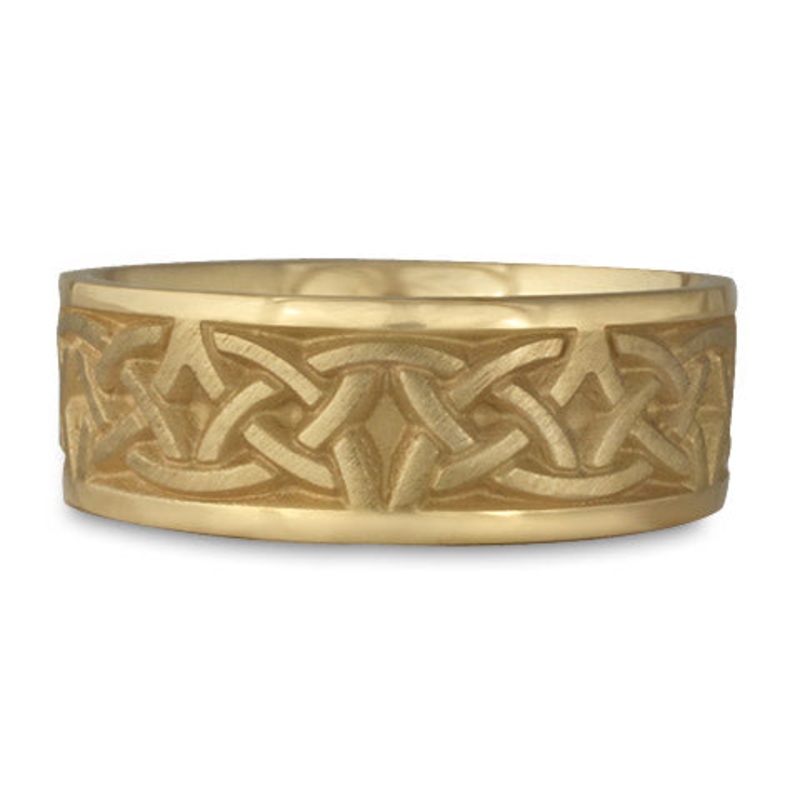 This Wide Celtic Arches Wedding Ring in 14K Yellow Gold by Katherine Aberle is made with eco-friendly methods using recycled 14K Yellow Gold. It is sent to you via free Fedex ground shipping. This ring is available in sizes ranging from size 5 through size 12. Other sizes may also be available. Please inquire by telephone for pricing on these.